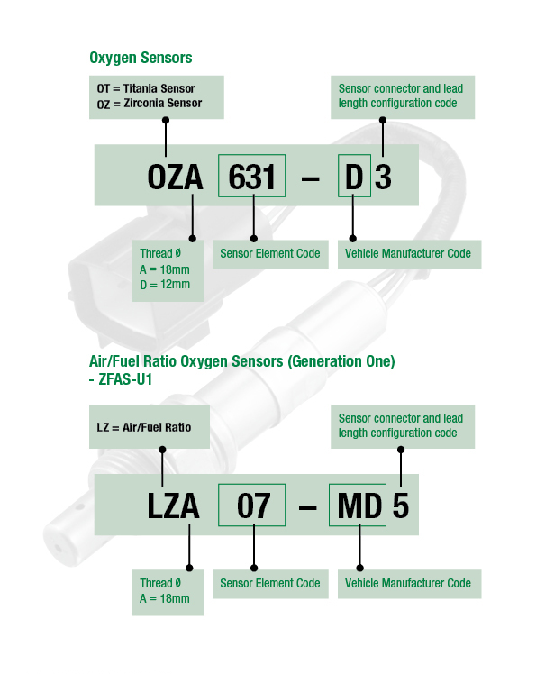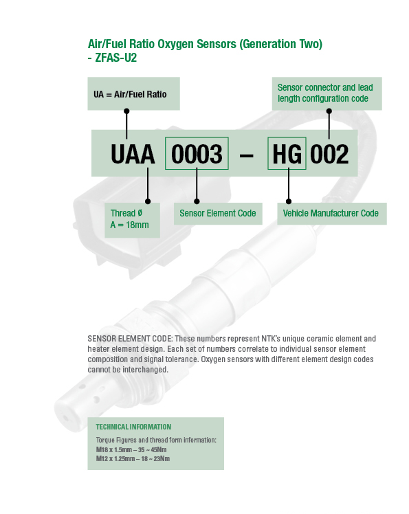 SENSOR ELEMENT CODE: These numbers represent NTK’s unique ceramic element and heater element design. Each set of numbers correlate to individual sensor element composition and signal tolerance. Oxygen sensors with different element design codes cannot be interchanged.